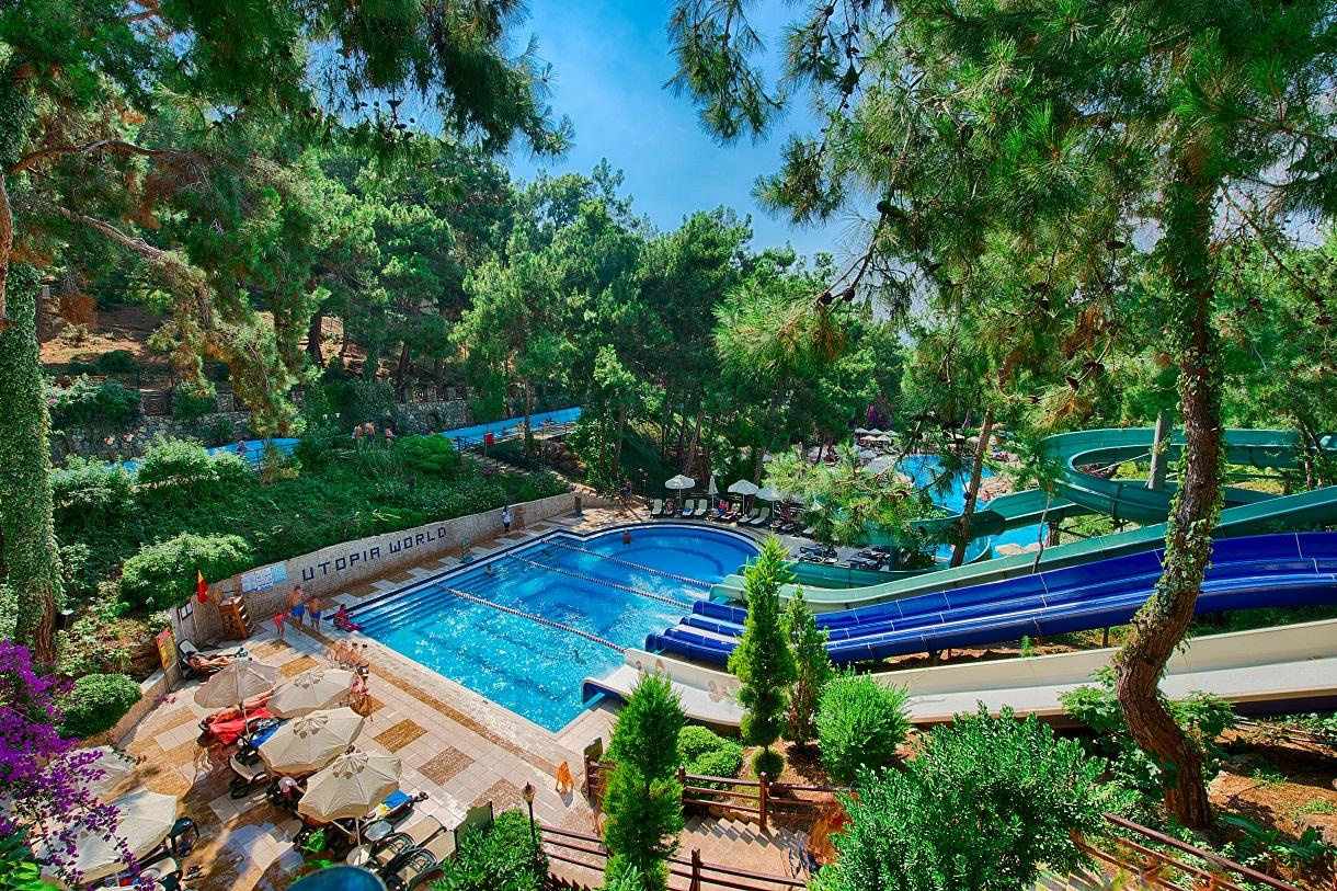 Fekvése: A 2007-ben nyílt Utopia World Hotel a tengerparthoz nagyon közel fekszik, egy gyönyörű domb tetején. Az autópálya felújítási ideje alatt a tengerpart közvetlen transzferrel érhető el (a felújítás ideje alatt a felüljárót és liftet lezárják). A szálloda a törökországi antalyai nemzetközi repülőtértől kb. 145 km-re, Alanya városközpontjától kb. 18 km-re, Manavgattól kb. 77 km-re található.