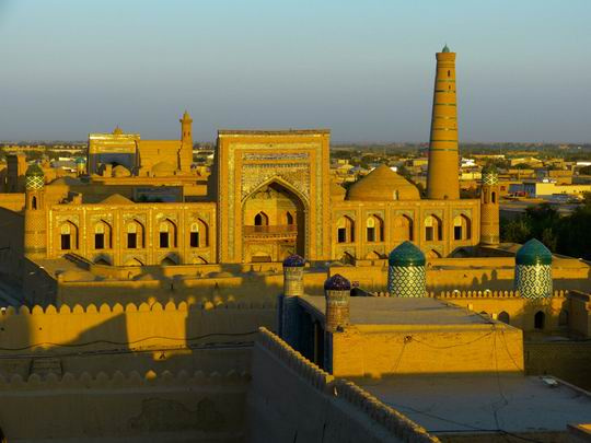 Megérkezés menetrendtől függően Urgencsbe, majd utazás busszal Khivába. Városnézés Khivában, mely során megtekintjük az UNESCO Világörökségek részét képező Ichan Kalát, a fallal körülvett óvárost, melynek különlegessége, hogy a városfalon belül több mint 50 történelmi emlékmű és 250-nél is több régi lakóház található. A nap folyamán láthatjuk a Kunya Ark erődőt, az Abd Al Bobo komplexumot, az Islam Khodja minaretet, a Djuma mecsetet és számos medreszét, melyek olyan mecsetek, ahol a vallással kapcsolatos emelt szintű oktatást végezték és végzik ma is. Vacsora egy helyi étteremben. Szállás Khivában.