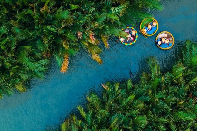 Biciklizünk az elárasztott rizsföldek közötti úton a "kókuszfaluba", Cam Thanhba (kb. egy óra), majd átszállunk egy hajóra, ami Cua Dai tengeri kikötőbe visz. Itt kipróbálhatjuk a halászatot, majd egy bambuszkosár csónakban lebegünk át a vízikókuszfák ölelésében hömpölygő kis folyót. Egy helyi családnál ebédelünk, helyben termelt és frissen halászott finomságokat.