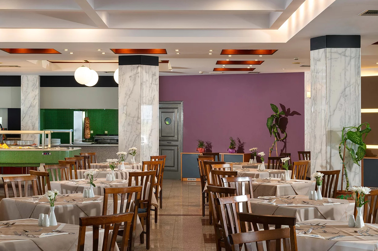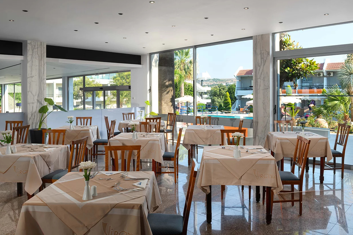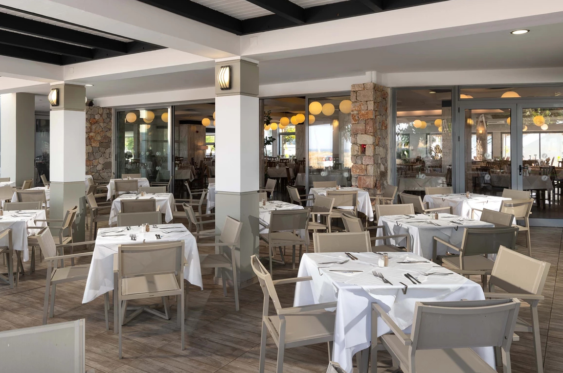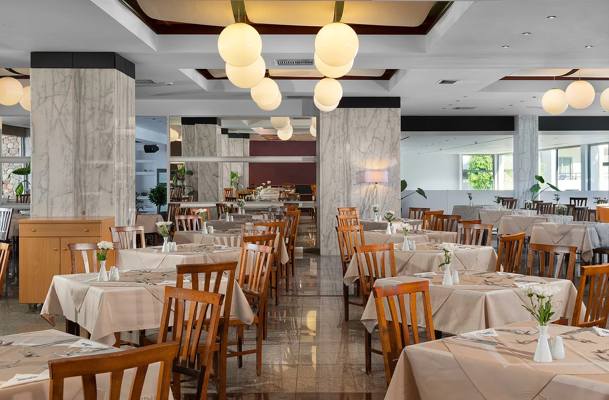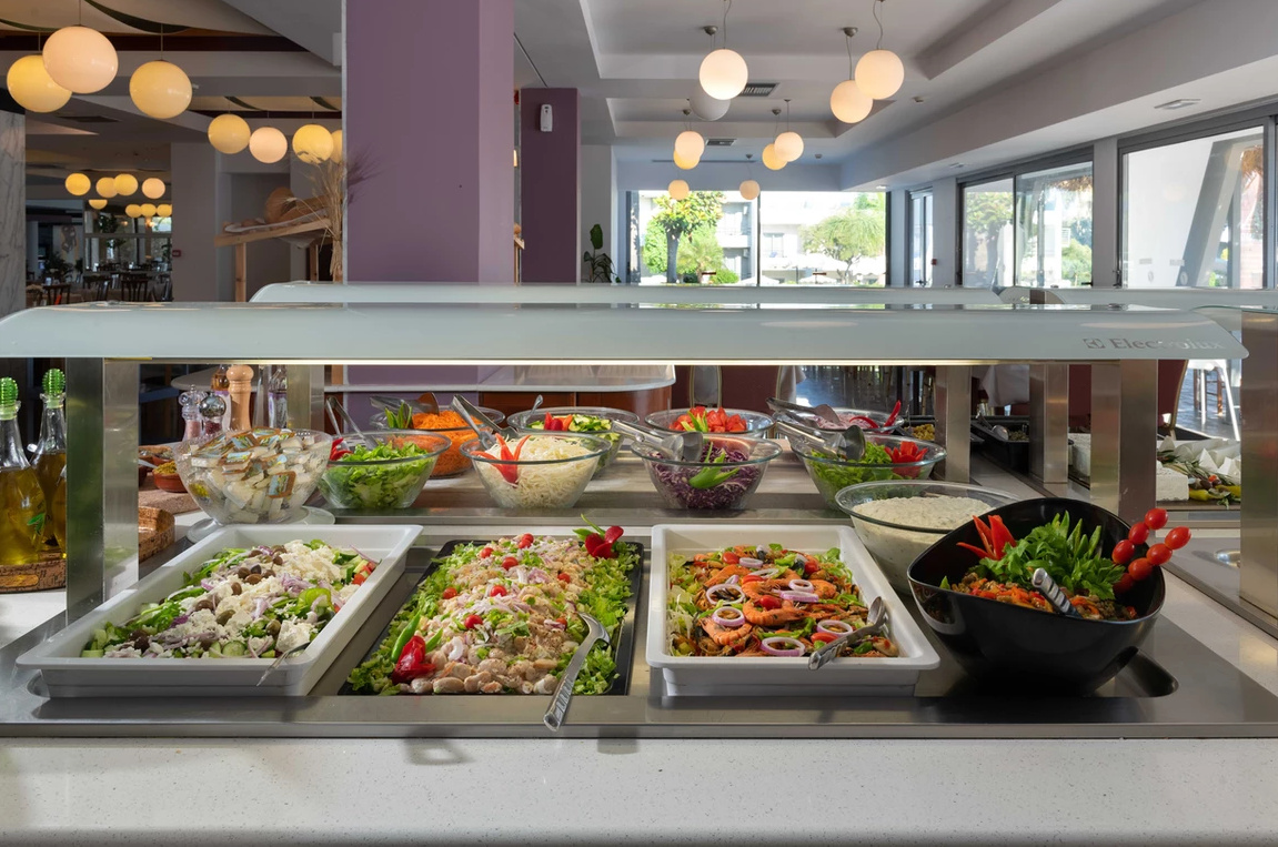All inclusive ellátással foglalható, mely tartalmazza a reggelit, ebédet, vacsorát, illetve helyi alkoholos- és alkoholmentes italokat. Két tematikus éttermében (tradicionális görög ízek, halételek) a vendégek tartózkodásuk alatt egyszer ingyenesen fogyaszthatnak, melyhez előzetes foglalás szükséges. Napközben snackételeket, kávét, teát, süteményeket, fagylaltot kínálnak. A szálloda bárjaiban alkoholos italok fogyasztása 12:00 és 23:00 óra között lehetséges. Az import italok, valamint az ír- és arabica kávék térítés ellenében kérhetőek.
