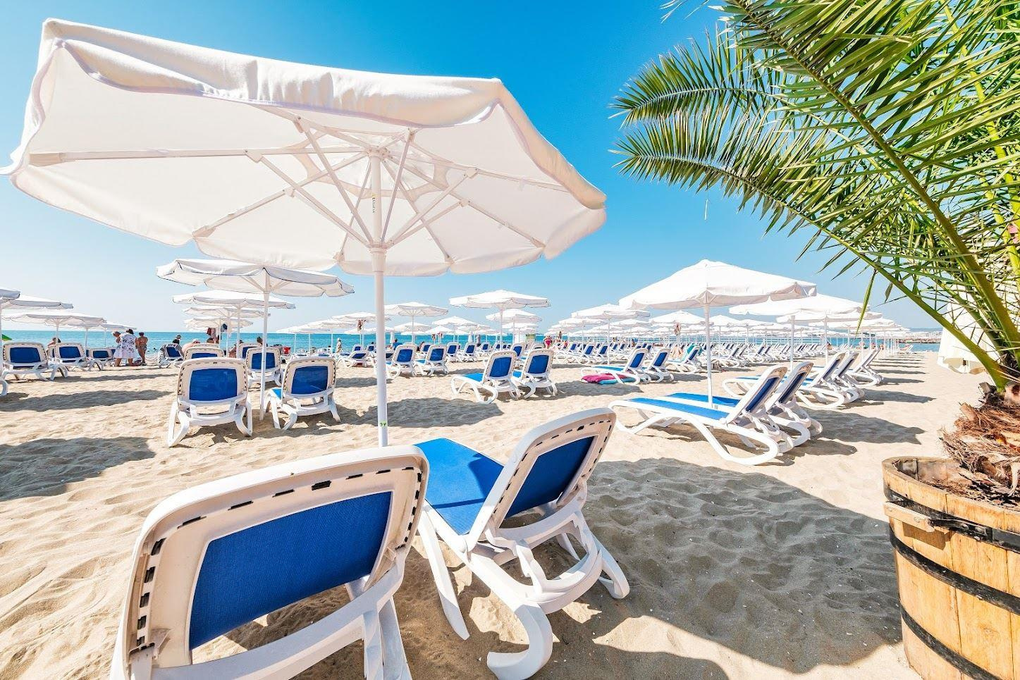 Napozóágyak és napernyők a strandon - felár ellenében.